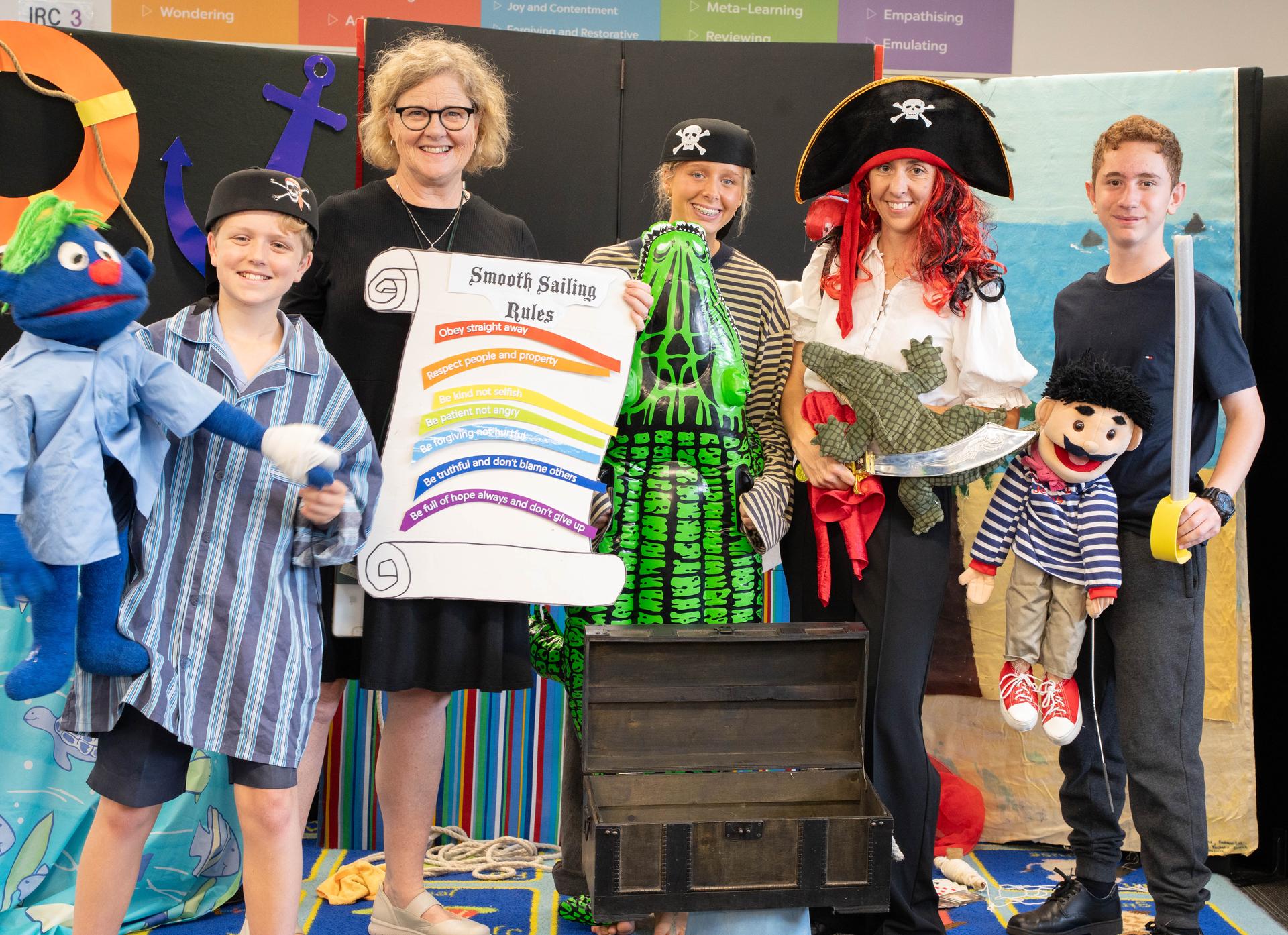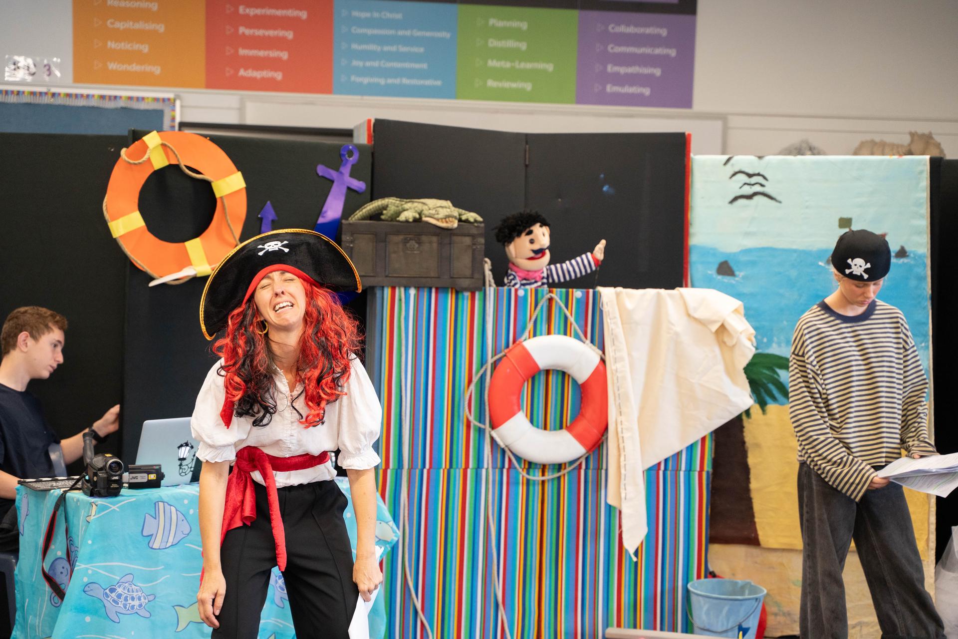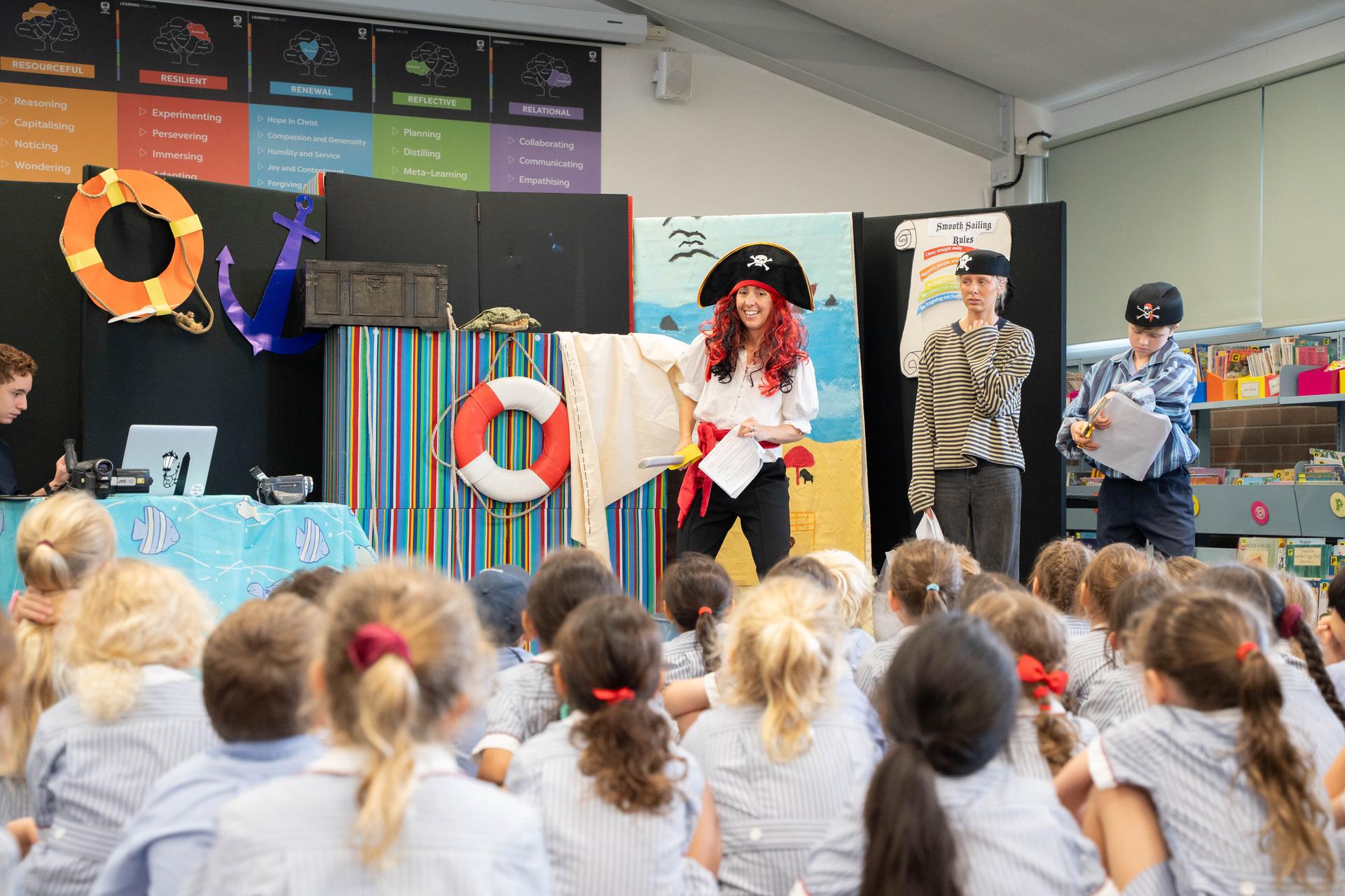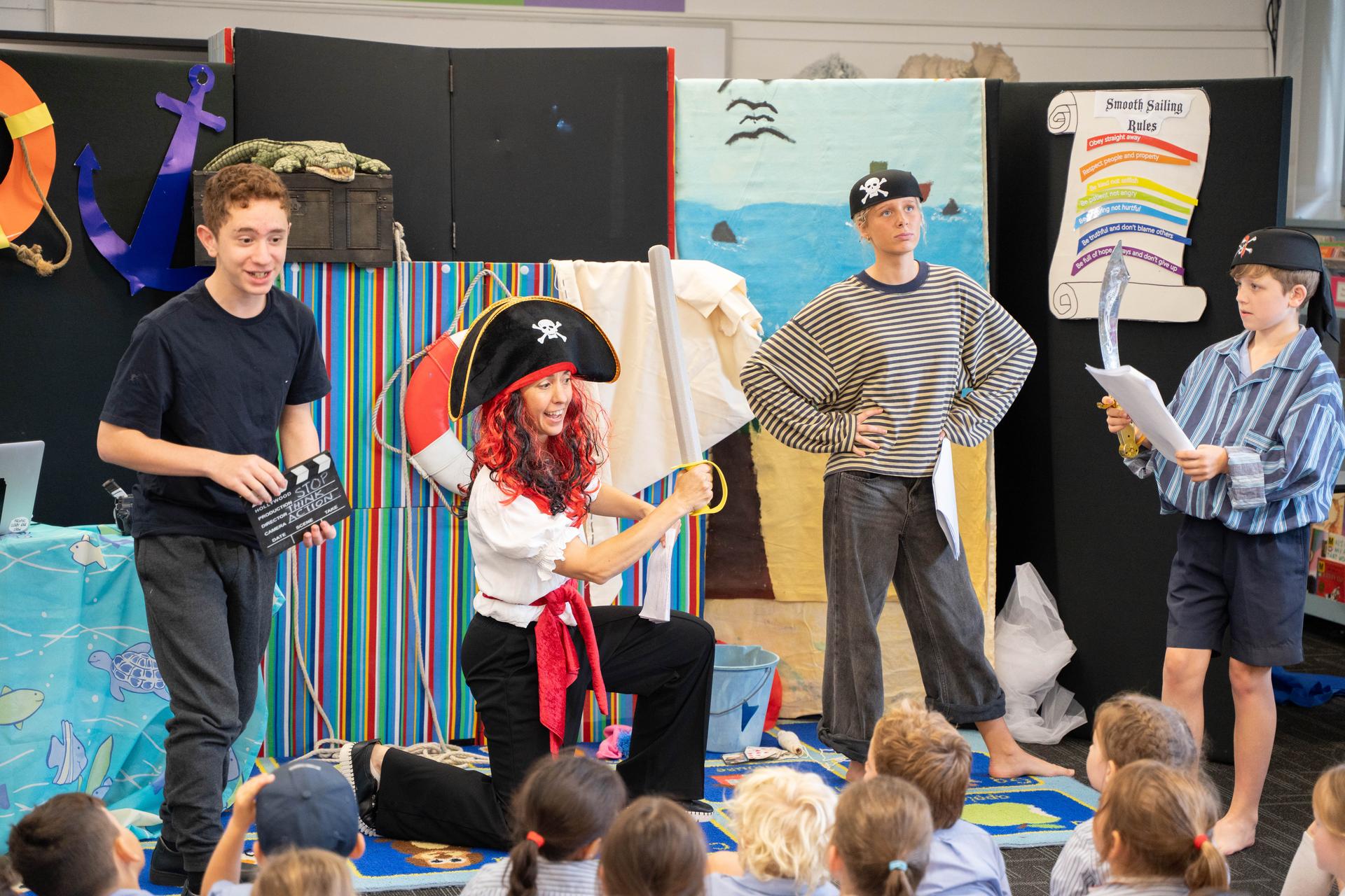 Recently, in term one, the children were watching a 'movie being made'. It was a movie about a Captain and his ship. The captain explains his rules to the crew but unfortunately he kept getting them wrong, like saying “Obey when you feel like it!” The film director, Pierre shouted “CUT!” They talked about what the correct rules should be, then started filming again after he called out “STOP, THINK then take ACTION!” During all the action on the 'high seas', a treasure chest was found, a sail ripped, an exciting wrestle happened between the captain and a crocodile, and a golden bookmark was given to all the children!