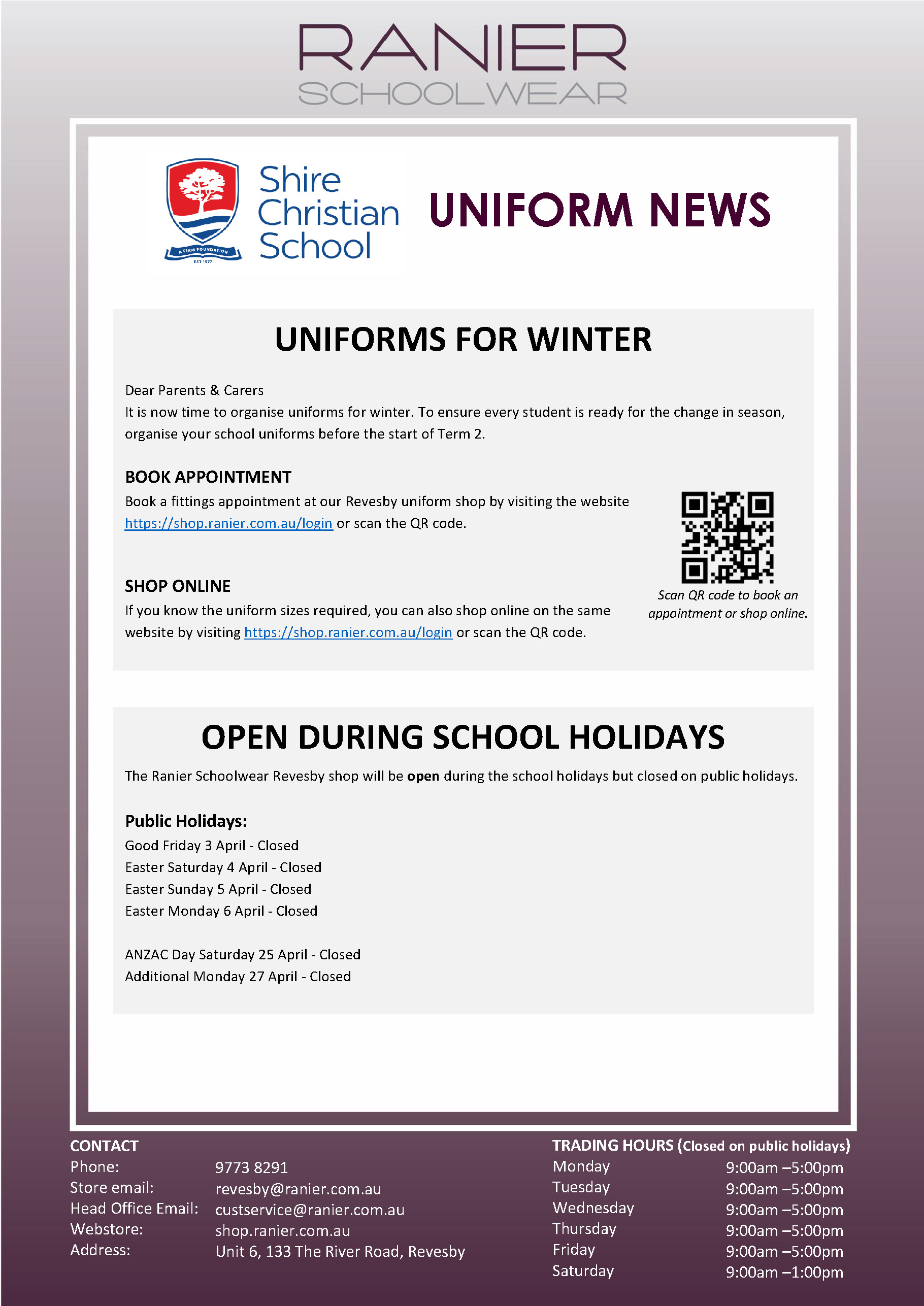 - Monday 27 April – ANZAC Day Public Holiday